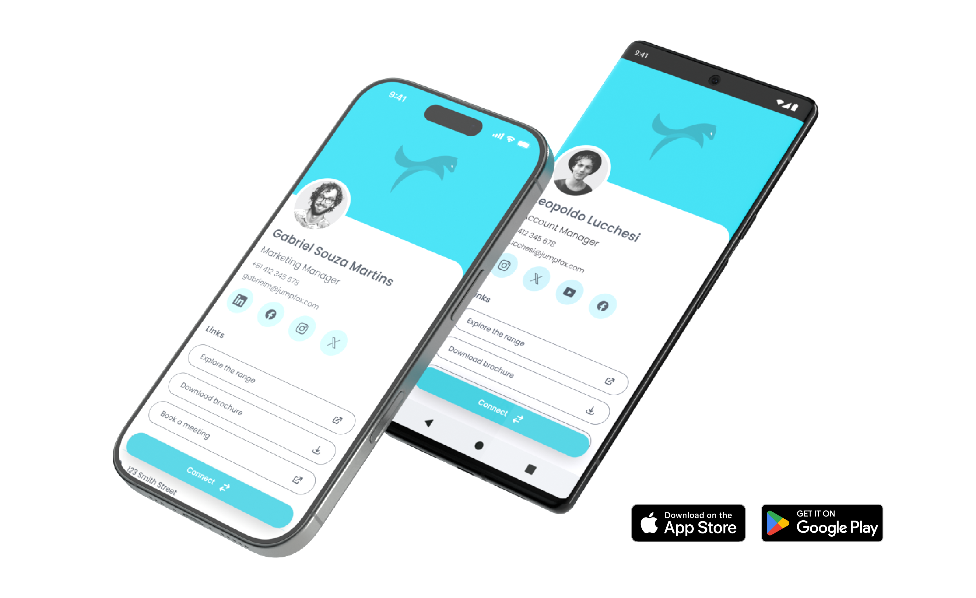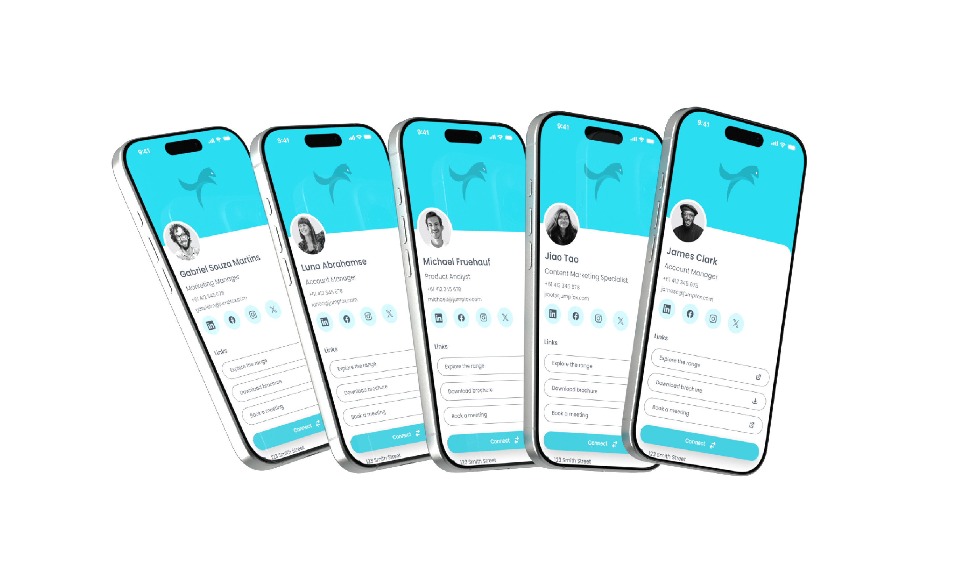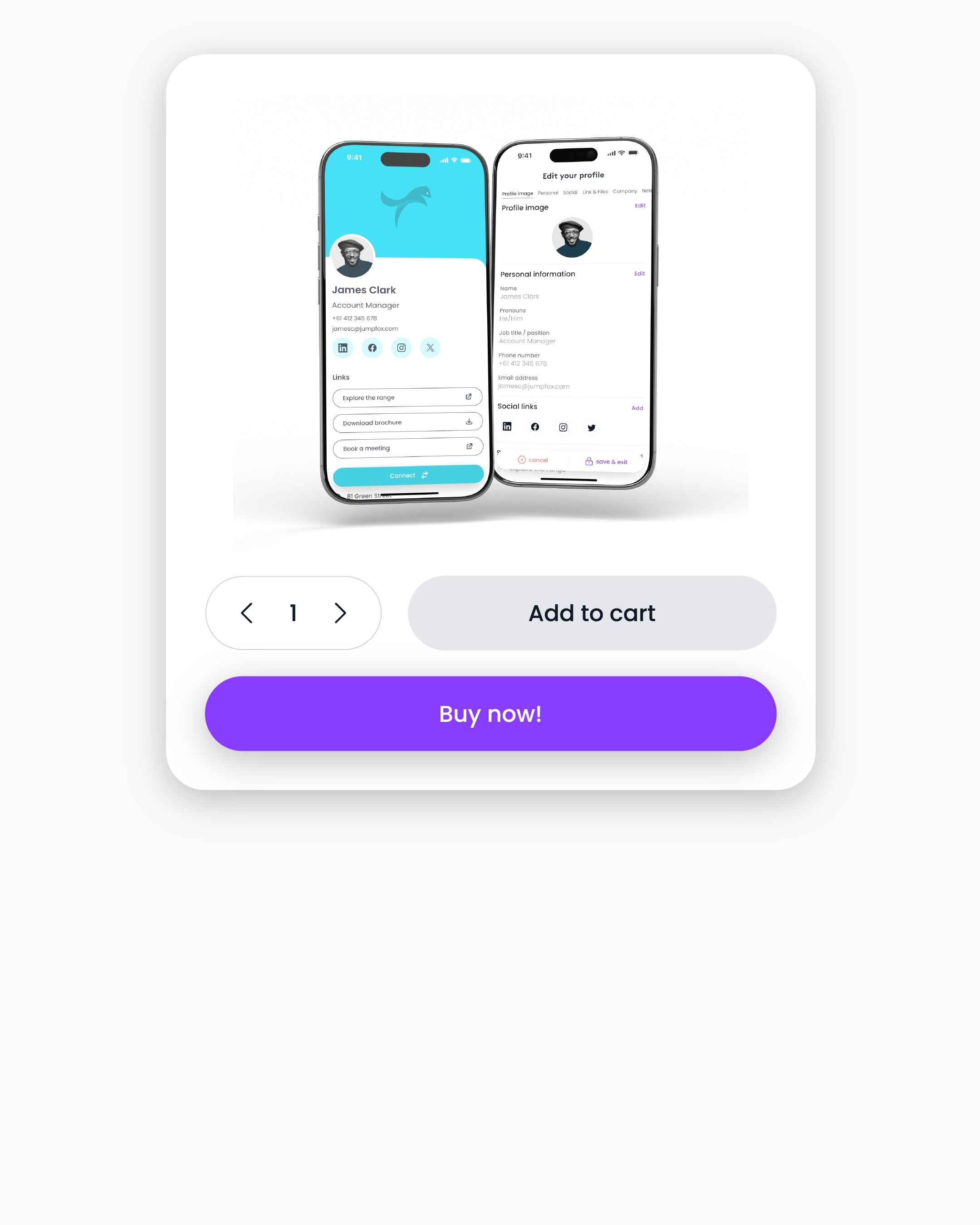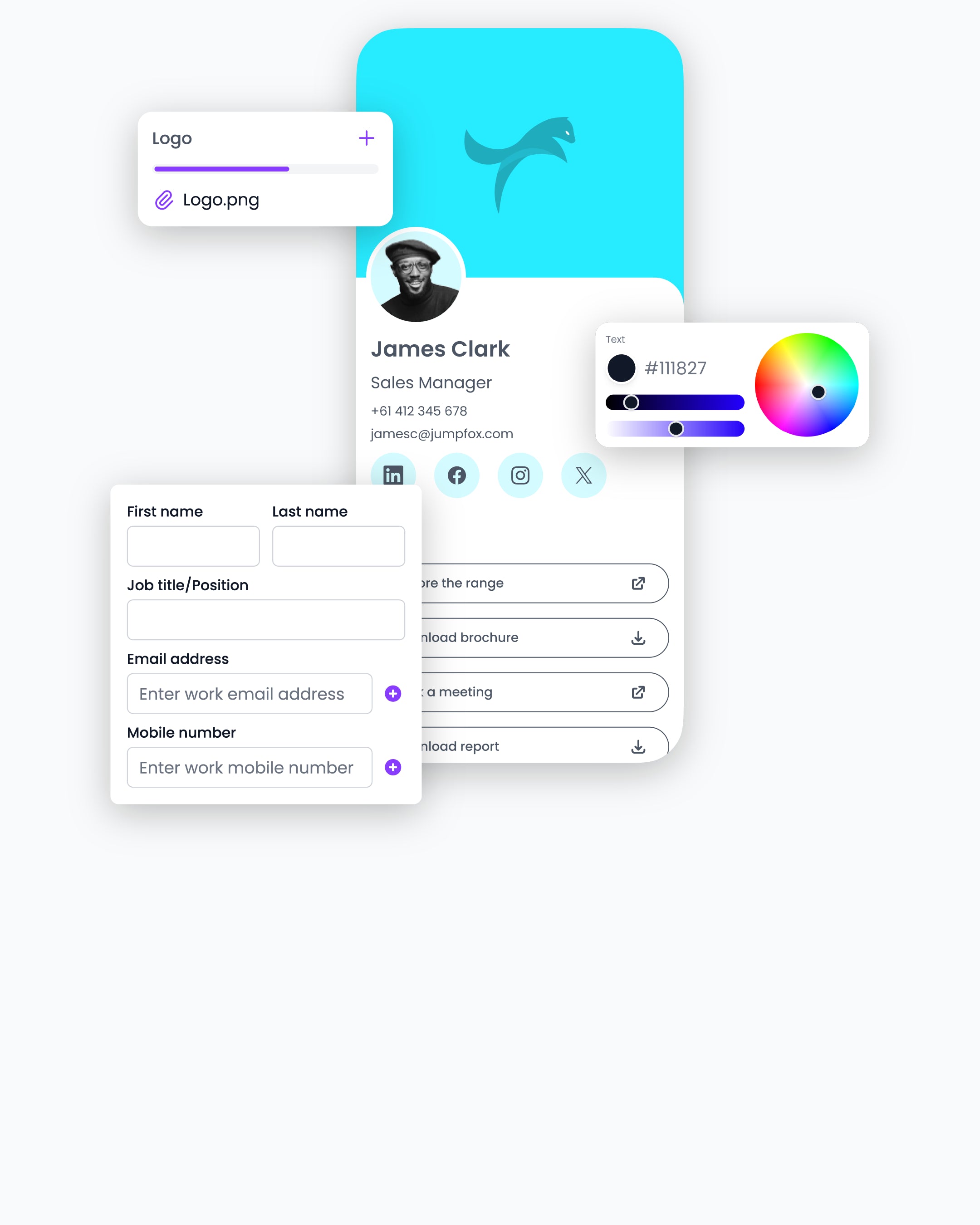 - Personalise each profile with personal details, company information, socials, links, and files.