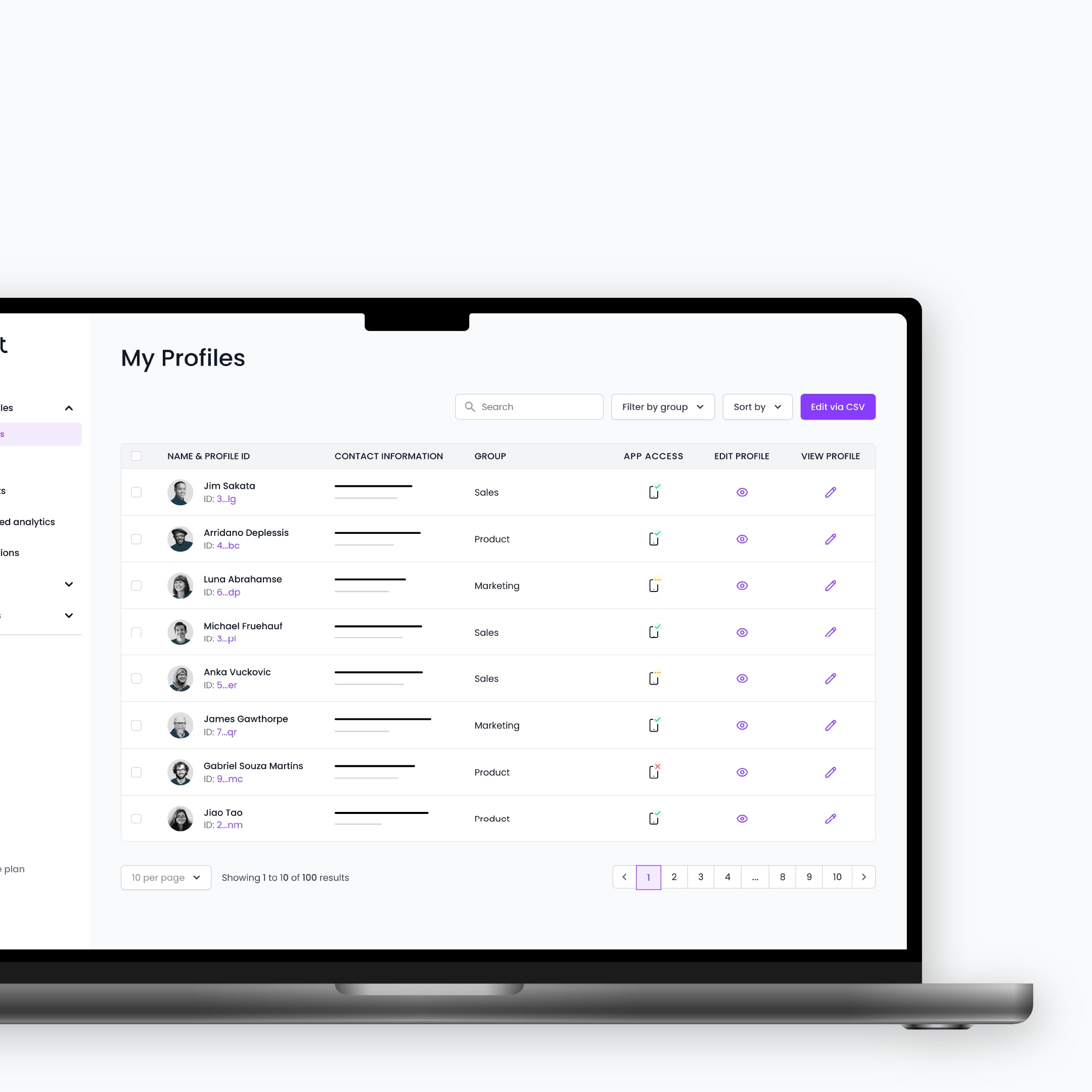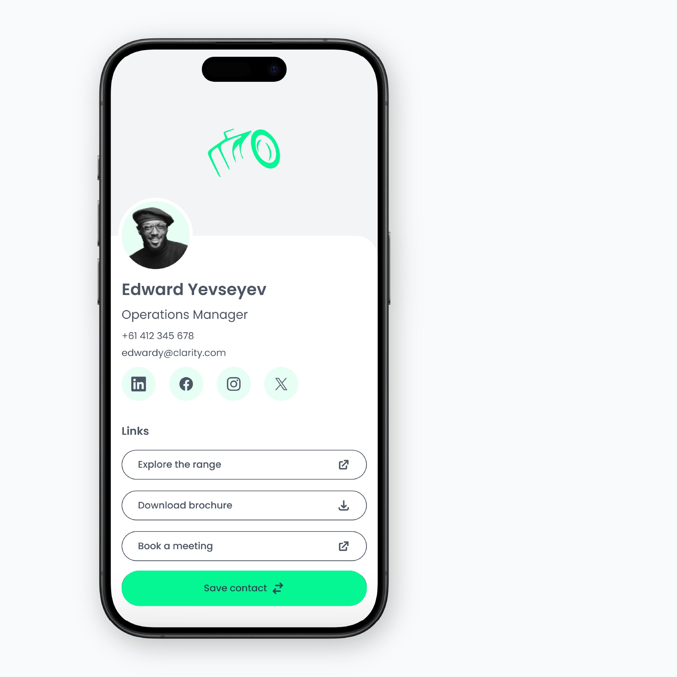- Personalise each profile with personal details, company information, socials, links, and files.