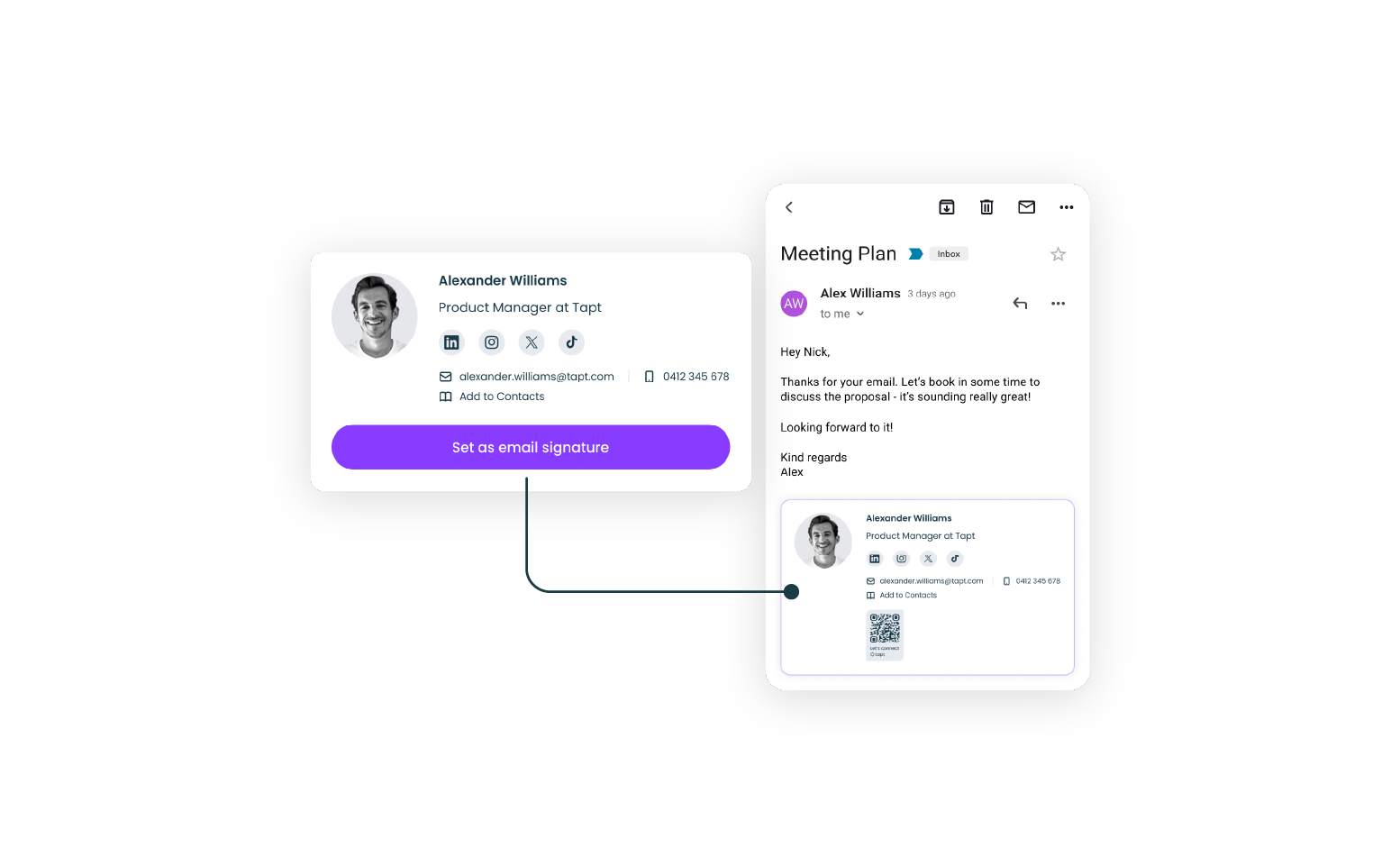 An email signature is a vital part of your business image. With Tapt, you can seamlessly generate and integrate a digital business card into your email signature, making it effortless for anyone to add you to their contacts in just a few clicks. Look professional and turn every email into a lead-gen magnet.