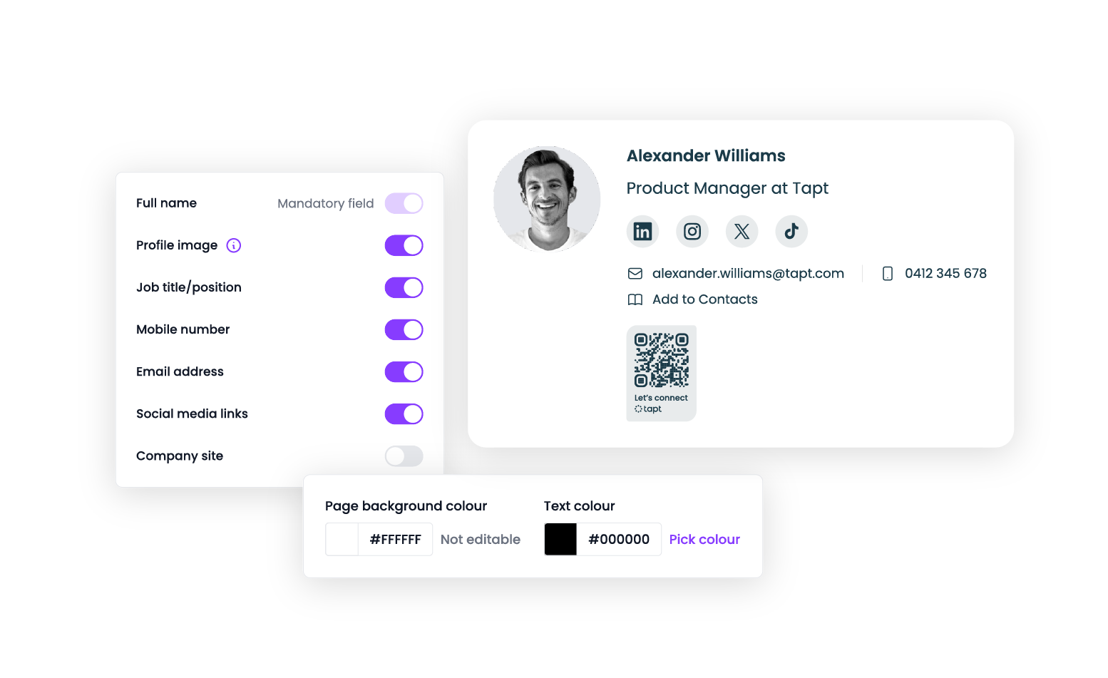 An email signature generator is a tool that helps you create professional, branded email signatures. It allows you to customise your signature with your name, job title, company logo, social media links, and other contact details - the same information stored on your Tapt profile. With Tapt, you can seamlessly integrate your profile into your email signature without needing design skills or expensive software.