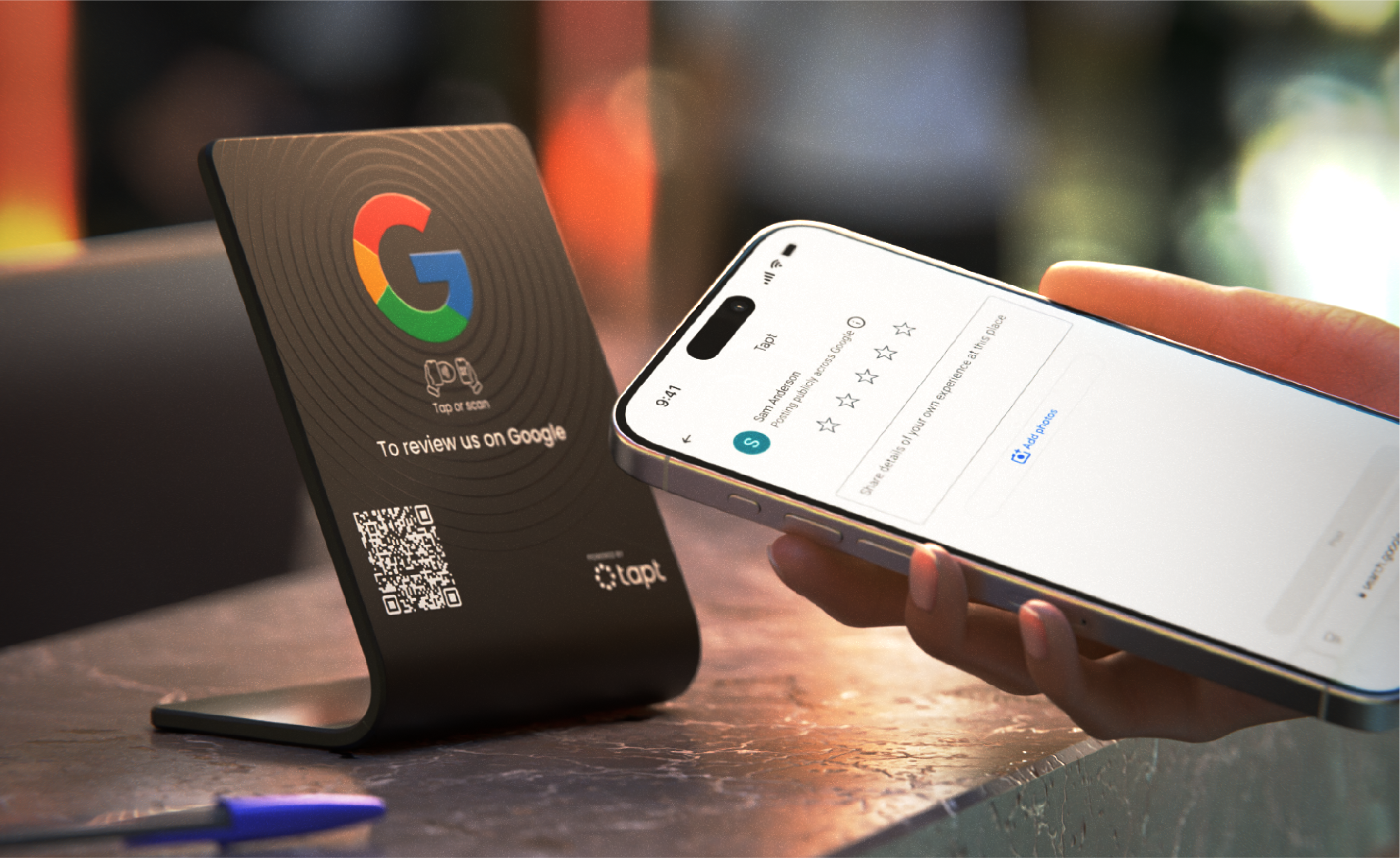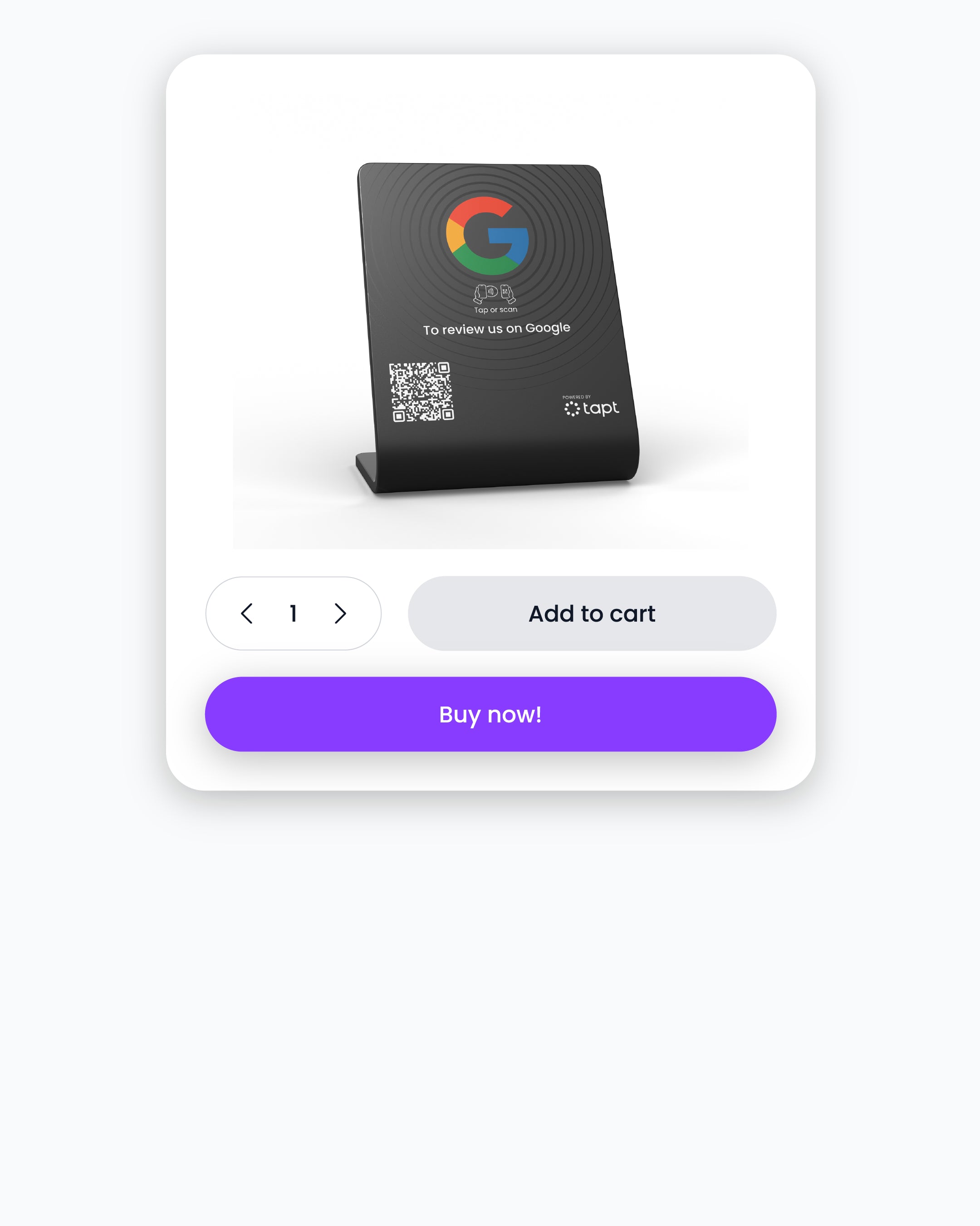 Enhance your business's online presence with the Tapt Google Review Stand! This stylish, minimalist stand encourages customers to leave a quick review with just a tap or scan, making it easier than ever to gather valuable feedback. Designed with a sleek black finish and the iconic Google logo, this stand is a modern addition to any counter space.